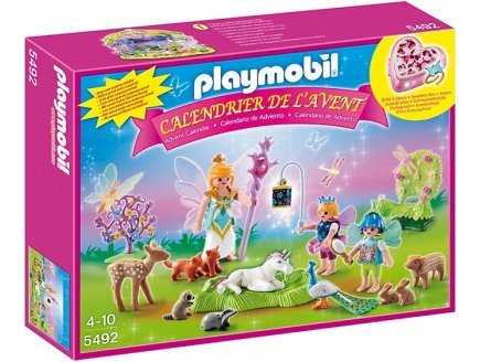 Description : Playmobil - 5492 - Calendrier De L'avent - Calendrier De L'avent "fées Avec Licorne Et Animaux De La Forêt" - âge : 4 / 10 ans - Contient 99 pièces: 1 personnage adulte( hauteur : 7,5 cm ), 2 deux personnages enfants ( 1 garçon et 1 fille ; hauteur 5,25 cm ), 1 « trône », 1 licorne blanche, 1 faon, 1 paon, ... - - Il y a même une boîte à bijoux avec une bague - chaque jour de décembre, une petite fenêtre à ouvrir avec un cadeau...pour créer une scène complète jusqu'a noël - le calendrier mesure 30 cm de large et 40 cm de haut - le décor fait 43 cm de long sur 26 cm de haut - âge : 4 / 10 ans - *** remarque du fabricant : avec une surprise inédite ***